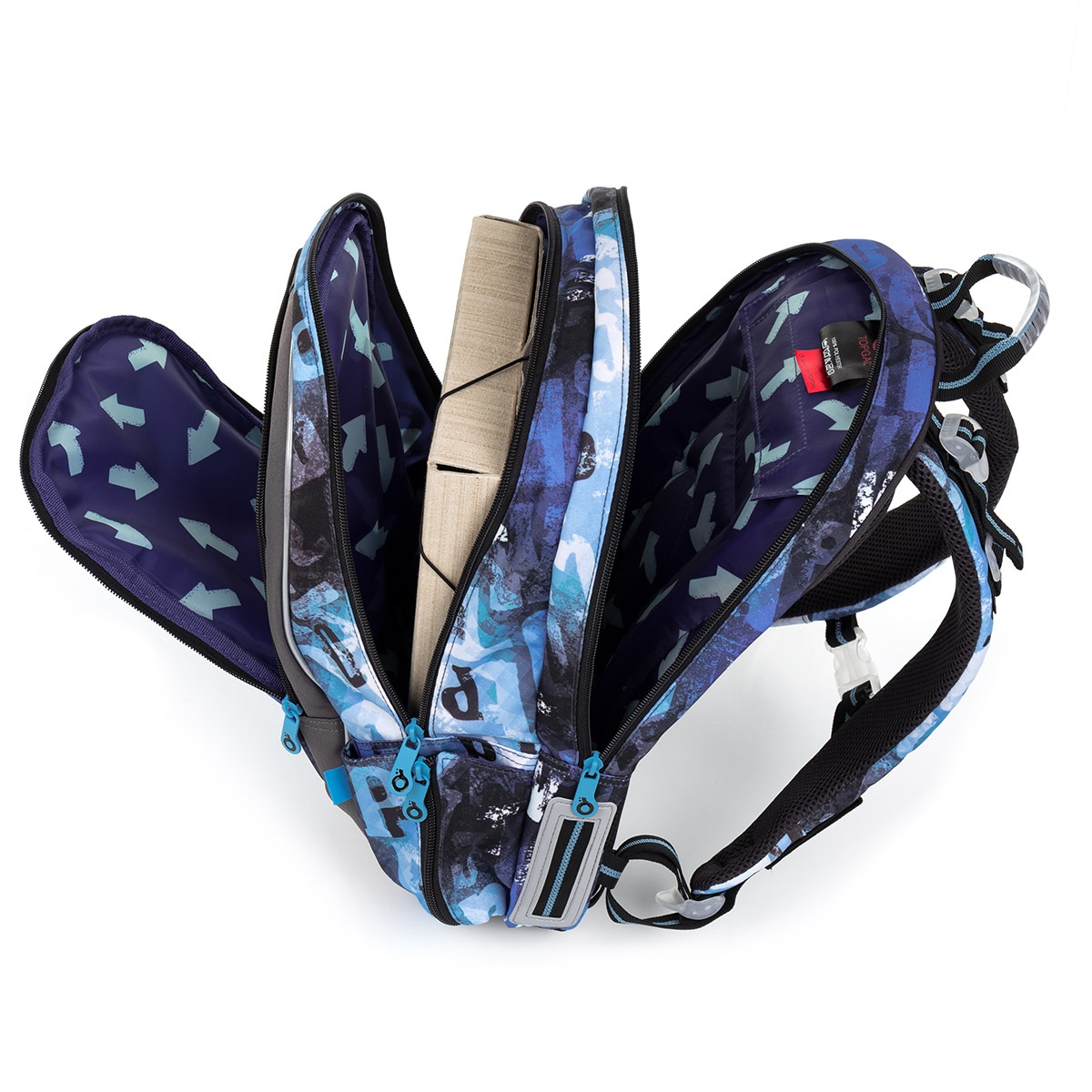Modrá barva, písmenka, čísla, dvě komory a velká přední kapsa. To je ideální batoh pro všechny chlapce na prvním stupni ZŠ. Do dvou velkých komor se vejde vše, co každý den nosí do školy.