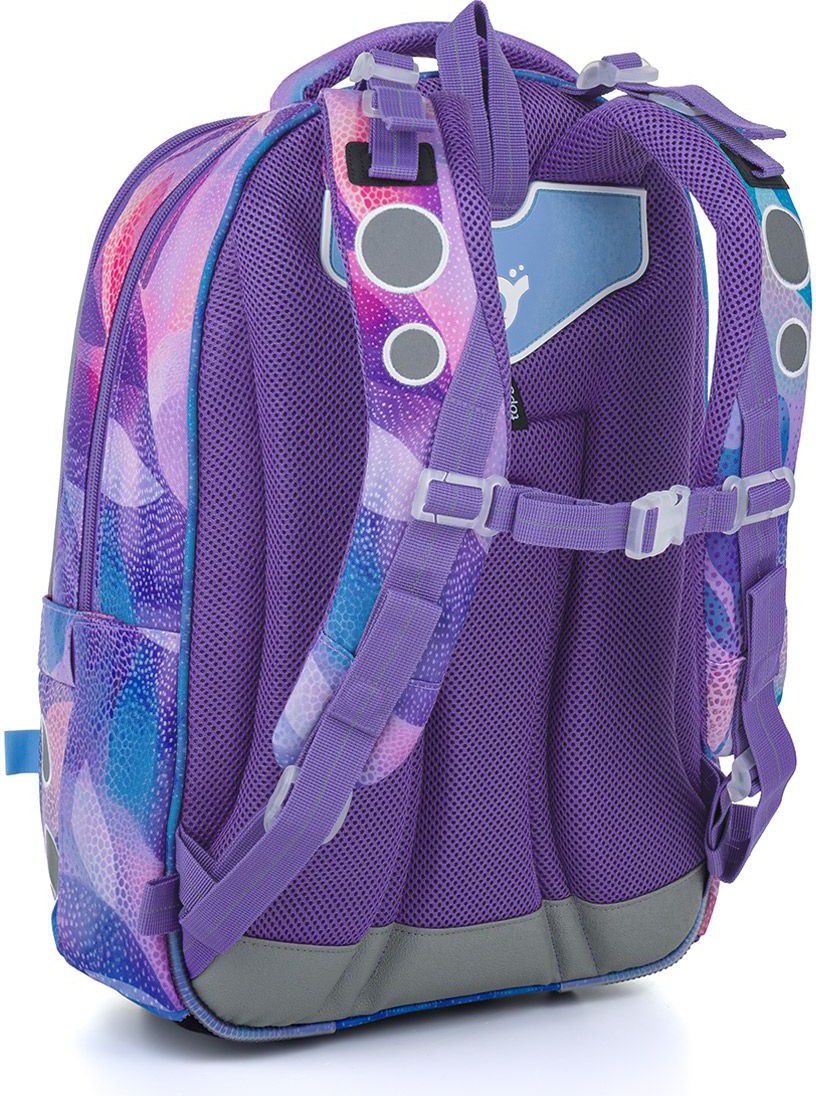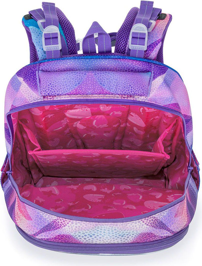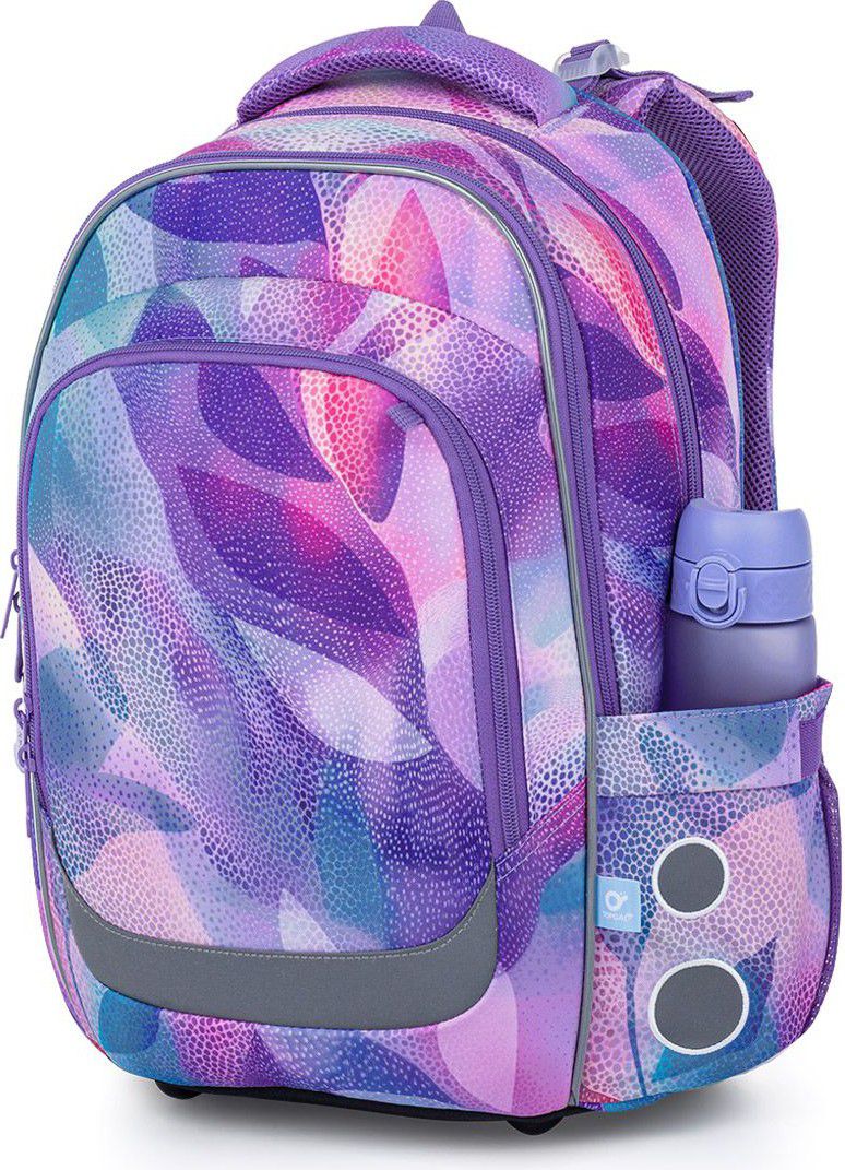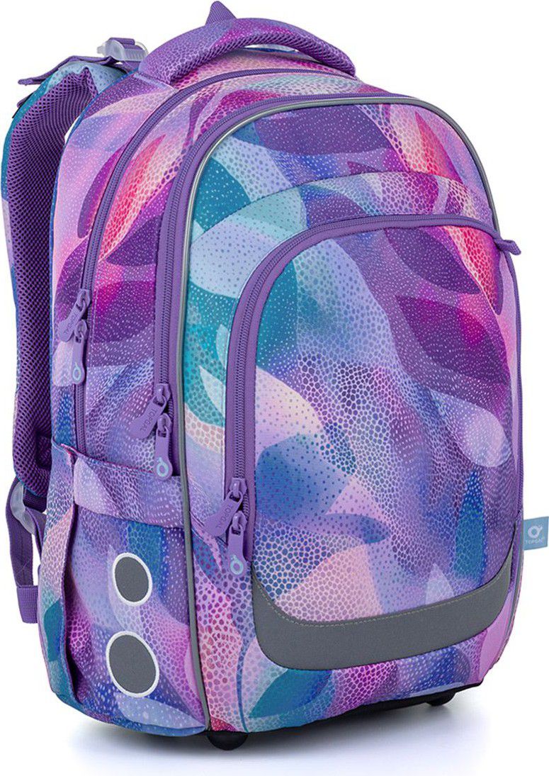 Školní batoh LORI 26009 je navržený pro školačky od 125 cm a díky svému objemu i konstrukci bez problémů vydrží až do 6. třídy. Pastelový abstraktní motiv v odstínech fialové, růžové a tyrkysové působí jemně, ale zároveň originálně – batoh tak skvěle doplní školní i volnočasový styl.