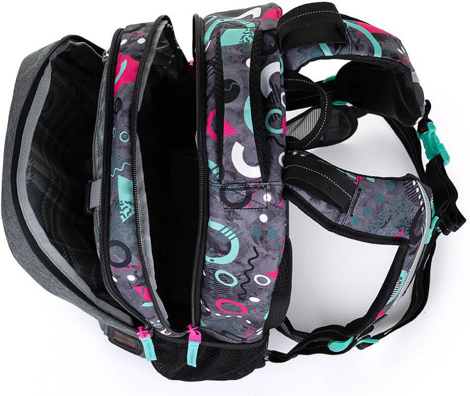 Ramenní popruhy jsou anatomicky tvarované a měkce polstrované. Popruhy je možné individuálně nastavit dle velikosti vašeho školáka, a to pomocí dolních plastových spon umístěných na ramenních popruzích. Součástí batohu je flexibilní hrudní páska k fixaci popruhů na ramenou školáka. Koncovky popruhů s reflexním prvkem a magnetem snadno uchytíte na konce ramenního pásu. Boční poutko pro uchycení navijáku na čip nebo klíče. Díky důmyslnému umístění tak vždy vklouznou přímo do boční kapsy.