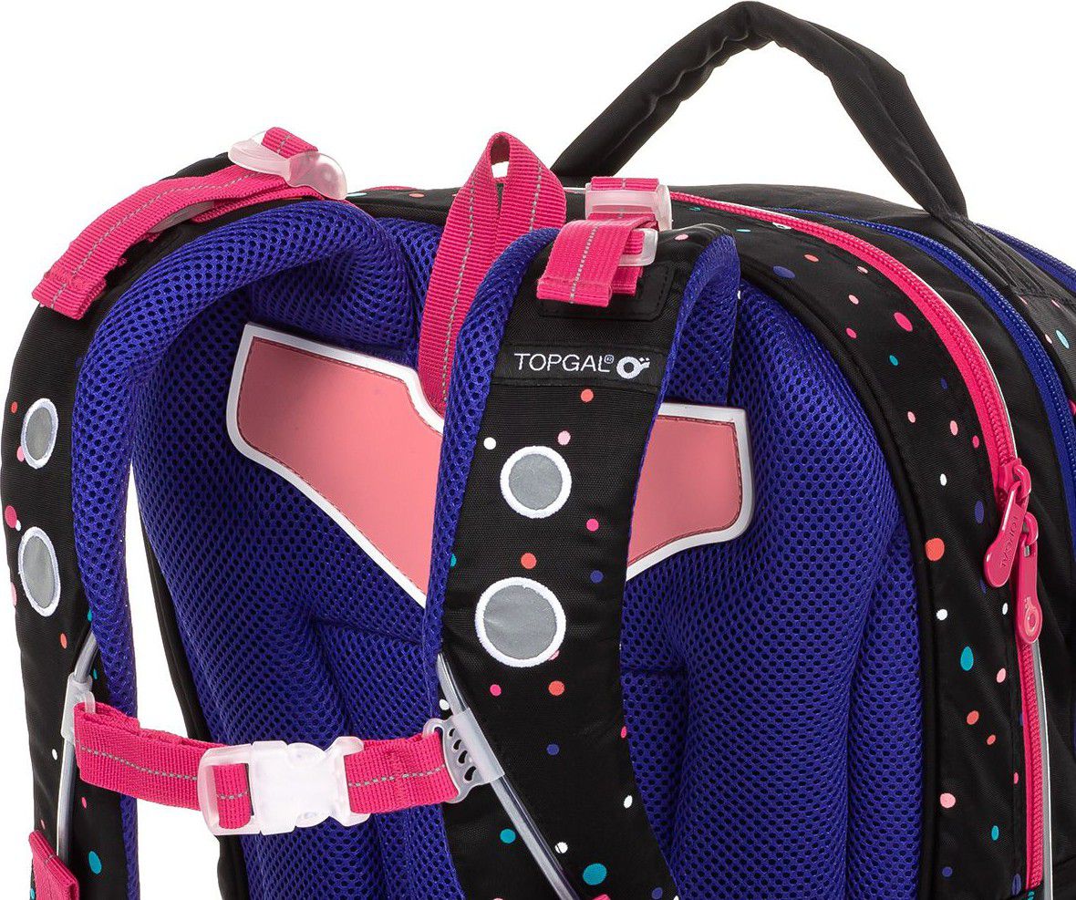Oblíbený objemný tříkomorový střih batohu pro první stupeň ZŠ jsme letos oblékli do střídmých praktických barev s vyšitými motýlky na přední kapse a barevnými puntíky. Navíc je doplněn chlupatým přívěskem. Batoh díky svému objemu vydrží po celý první stupeň ZŠ! velikostně ideální do 1. – 5. třídy ZŠ pevná anatomicky tvarovaná záda a hrudní popruh tři komory a hluboká přední kapsa vhodný od první třídy Střih COCO je zřejmě našim nejoblíbenějším pro první stupeň ZŠ. Tři objemné komory pojmou úplně všechno učivo od první třídy klidně až do páté. O praktický černý batoh si psaly hlavně maminky. Malé školačky ale určitě ocení barevné vyšívané motýlky, chlupatý přívěsek, puntíky i barevné zipy. Všechny tyto prvky tmavý batoh oživují. Záda batohu jsou vyvedena v modré barvě. Jsou pevná, anatomicky tvarovaná a polstrovaná s lehounkou hliníkovou výztuhou. Na záda i drobnějších dívek batoh správně nasadíte díky ramenním popruhům, které lze utáhnout v jejich horní i spodní části. Díky dopnutí hrudního pásu batoh ze zad padat určitě nebude ani v zimě, kdy občas popruhy batohů kloužou po bundách. V koncích popruhů jsou všity magnetky, díky kterým je můžete připnout k tělu ramenního popruhu tak, aby nevisely kolem těla. Zadní a prostřední komory jsou užší - ideální pro ukládání desek na sešity, cvičebnic, nebo těch nejtěžších učebnic. Přední komora je nejširší, nejobjemnější a navíc v ní najdete i praktickou kapsičku na zip a odnímatelnou karabinku na klíče, díky které je nebudete muset v batohu hledat. Přední hluboká kapsa je ideální na všechny další drobnosti. Můžete do ní umístit třeba i krabičku se svačinkou, nebo penál ve stejném designu PENN 20004. Uvnitř kapsy je jmenovka. Na boku batohu je pak kapsička na lahvičku na pití. Radíme do lahvičky dát jen sirup, vodu si děti mohou dopustit ve škole. Reflexní prvky najdete všude na tomto batohu - jsou na čele, v paspulích batohu, boku batohu i na ramenních popruzích. Vše připraveno? Tak šup, rychle do školy! Další vychytávky: měkké ucho na přenášení batohu v ruce ouško na zavěšení batohu na lavici zátěr proti dešti p evný nepropustný materiál TOPDURA na dnu batohu batoh byl úspěšně otestován v ITC Zlín Náš tip: Hliníkovou výztuhu zad nevytahujte, zádový systém by tak ztratil anatomický tvar a utrpěla by i pevnost batohu. Váha výztuhy je pouze 0,06 kg!