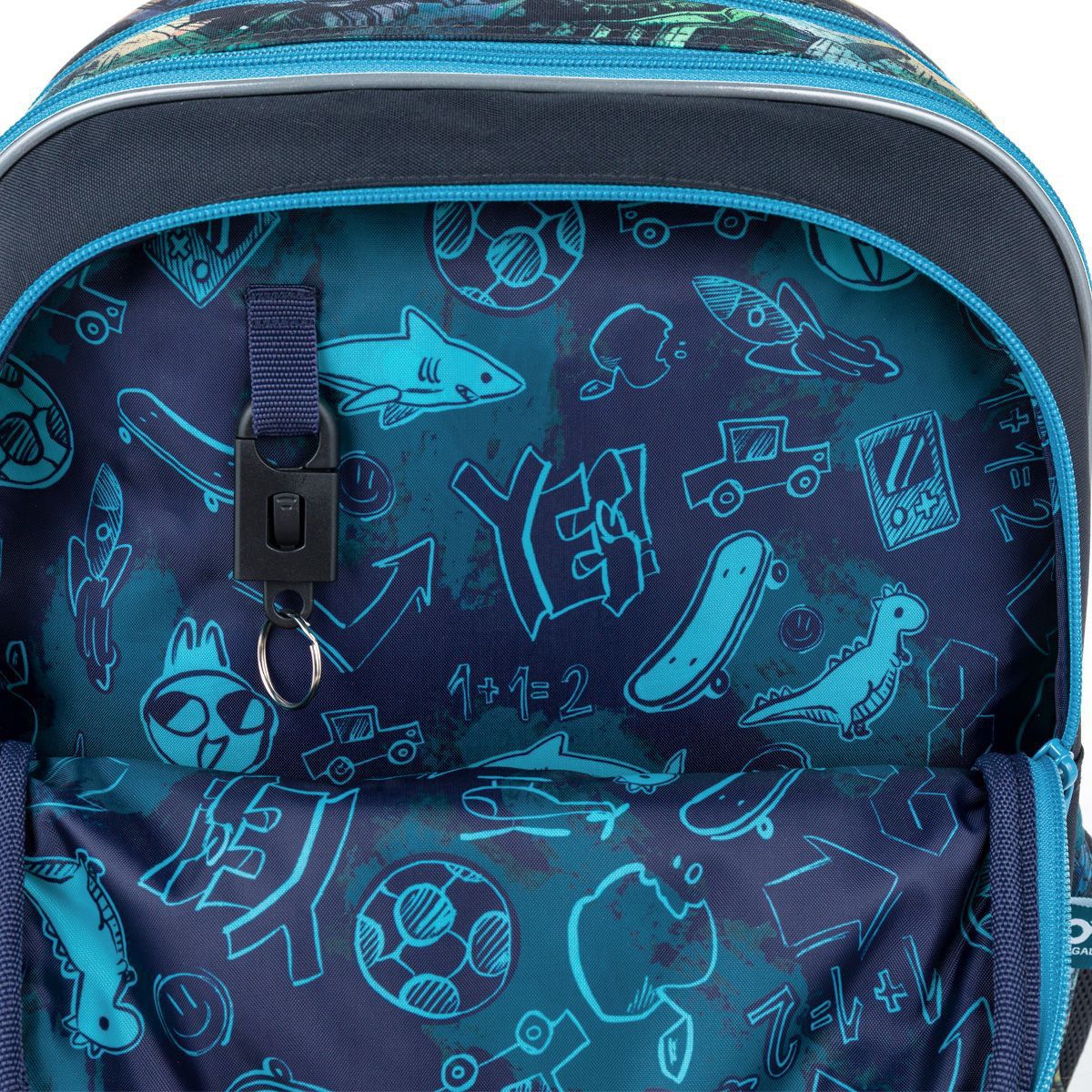 Vnitřní prostor je přehledně členěný tak, aby se v něm malé děti snadno orientovaly. Do hlavní komory doporučujeme uložit učebnice nebo desky na sešity, přední kapsa je ideální na lehčí školní výbavu, například penál nebo box na svačinu. Samozřejmostí je také odnímatelná karabina na klíče.