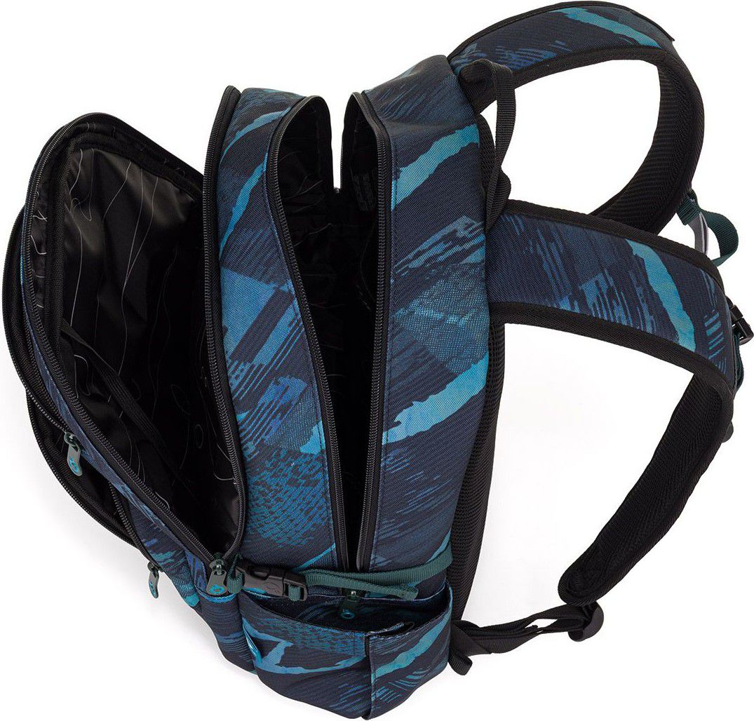 Batoh má dvě hlavní komory – v té zadní najdeš polstrovanou kapsu na notebook a síťovanou kapsu na zip. Přední komora ukrývá praktickou klíčenku a organizér na drobnosti. Vpředu jsou tři kapsy – horní polstrovaná ideální na telefon nebo powerbanku, spodní větší na ETUE 25032 nebo svačinu. Po stranách batohu jsou dvě kapsy na lahev, které pohodlně pojmou i 1,5l PETku.