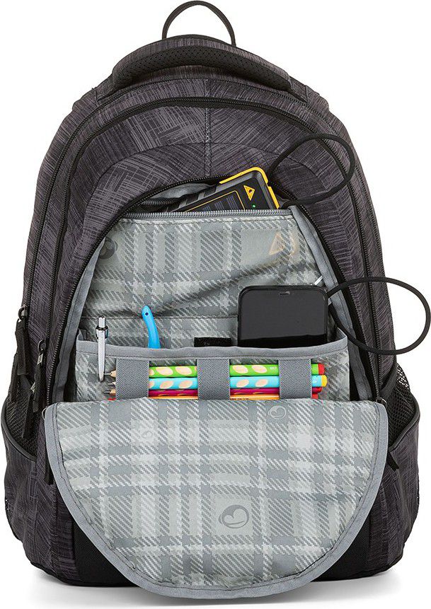 Batoh má vyztužená záda, hrudní pás a nastavitelné ramenní popruhy, které správně obepnou postavu