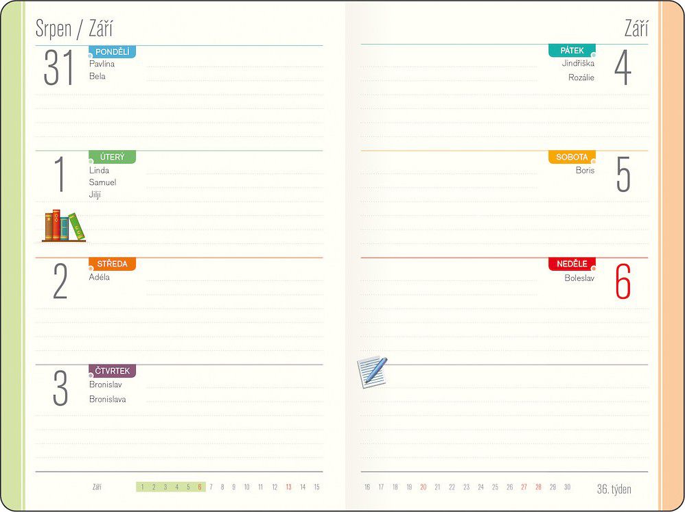 Obsahuje české kalendárium, rozvrh hodin, adresář, přehled školních prázdnin a užitečné informace z předmětů jako matematika, chemie, fyzika a český jazyk, což usnadní přípravu na školní úkoly i plánování.