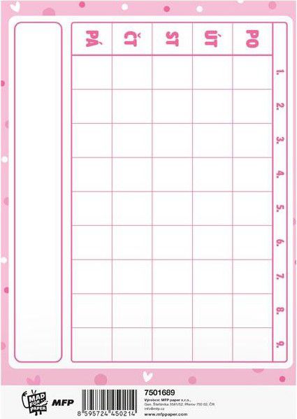 Každý školní den přináší nové úkoly a poznámky, které je potřeba mít přehledně zaznamenané. Úkolníček MFP s motivem koaly nabízí jasně uspořádaný prostor pro zapisování zadání z hodin i dalších školních informací. Velikost A6 je praktická pro každodenní nošení do školy – úkolníček se pohodlně vejde do aktovky. Přehledné rozvržení stránek usnadňuje orientaci v zápisech a pomáhá udržet pořádek v tom, co je potřeba splnit nebo připravit na další den. ÚKOLNÍČEK OBSAHUJE: - osobní údaje - telefonní čísla - prostor pro poznámky - malou násobilku - geometrické a matematické vzorce - vyjmenovaná slova - rozvrh hodin Formát: A6 Motiv: koala Počet stran: 40 Uvedená cena je za 1 ks.
